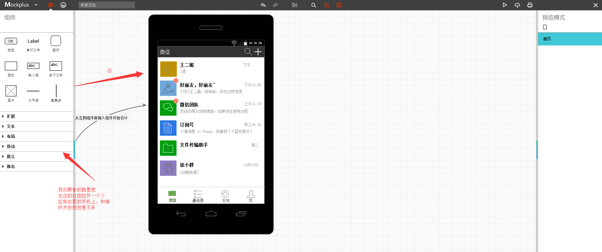 我们要做的就是从左边的组件栏中啦控件到手机界面上,当然,我们可以双击某个控件,自定义我们 的样式,比如颜色,背景图片等!