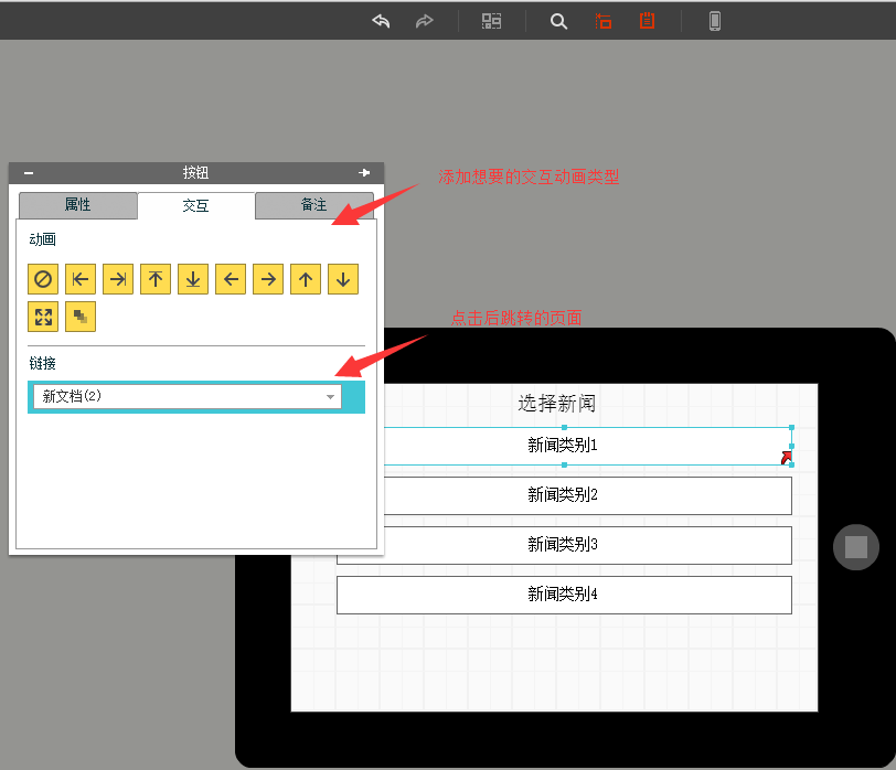 Step 2:交互实现: 界面原型除了界面外,肯定是少不了交互的,这里我们做一个简单的新闻应用的交互例子给大家体验下: 我们在其中一个新闻类别中添加跳转链接,