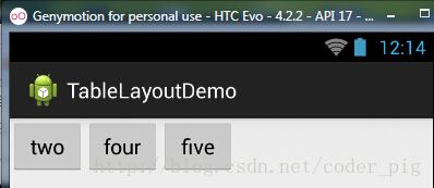 流程:在TableRow中定义5个按钮后,接着在最外层的TableLayout中添加以下属性: android:collapseColumns = "0,2",就是隐藏第一与第三列,代码如下: