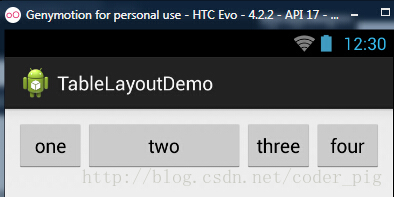流程:在TableLayout中设置了四个按钮,接着在最外层的TableLayout中添加以下属性: android:stretchColumns = "1"