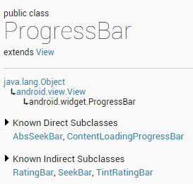 ProgressBar继承与View类,直接子类有AbsSeekBar和ContentLoadingProgressBar, 其中AbsSeekBar的子类有SeekBar和RatingBar,可见这二者也是基于ProgressBar实现的