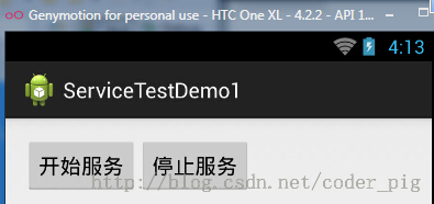 再接着是简单的布局文件,两个按钮,再最后是MainActivity的编写,在按钮的点击事件中分别 调用startService( )和stopService( )!