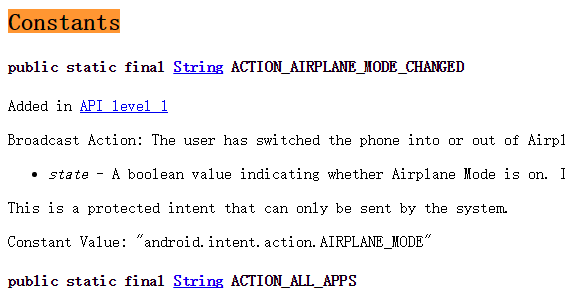 本来想直接贴以前收集到的Intent Action的,后来想想还是算了,授之以鱼,还不如授之以渔, 如果你下载了Android的文档的话,可以在下述路径: