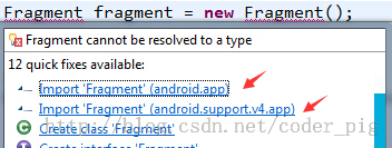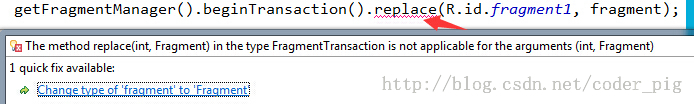 有点莫名其妙啊,Fragment,FragmentManager,FragmentTransaction都是用的v4包啊, Activity也是继承FragmentActivity的啊?都改成app包就可以了,但是这不和我们用v4包的 前提冲突了么?其实也是有解决方法的哈?