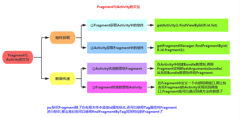Activity获得Fragment中的组件(根据id和tag都可以):getFragmentManager.findFragmentByid(R.id.fragment1);