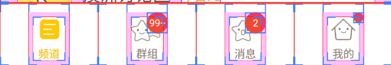 前面我们已经跟大家讲解了实现底部导航栏的两种方案,但是这两种方案只适合普通的情况,如果 是像新浪微博那样的,想在底部导航栏上的item带有一个红色的小点,然后加上一个消息数目这样, 前面两种方案就显得无力了,我们来看看别人的APP是怎么做的,打开手机的开发者选项,勾选里面的: 显示布局边界,然后打开我们参考的那个App,可以看到底部导航栏是这样的:
