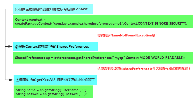 }核心: 获得其他app的Context,而这个Context代表访问该app的全局信息的接口,而决定应用的唯一标识 是应用的包名,所以我们可以通过应用包名获得对应app的Context 另外有一点要注意的是:其他应用的SP文件是否能被读写的前提就是SP文件是否指定了可读或者 可写的权限,我们上面创建的是MODE_PRIVATE的就不可以了~所以说你像读别人的SP里的数据, 很难,另外,一些关键的信息,比如密码保存到SP里,一般都是会做加密的,所以只能自己写自己玩~ 等下会讲下常用的MD5加密方法!