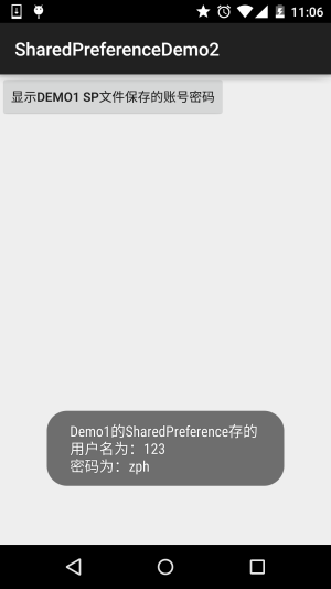 Toast.makeText(getApplicationContext(), "Demo1的SharedPreference存的\n用户名为:" + name + "\n密码为:" + passwd, Toast.LENGTH_SHORT).show();