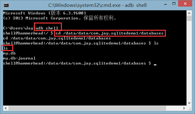 2.进入adb shell,接着键入下述指令,来到我们app的databases目录下: