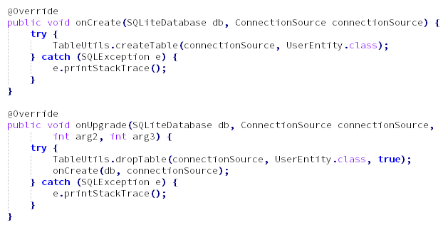 public void onUpgrade(SQLiteDatabase db, ConnectionSource connectionSource, int arg2, int arg3) { switch(arg2){ case 1: db.execSQL(第一个版本的建表语句); case 2: db.execSQL(第二个版本的建表语句); case 3: db.execSQL(第三个版本的建表语句); } }细心的你可能发现这里并没有写break,这就对了,这是为了保证跨版本升级时,每次数据库 修改都能全部执行到!这样可以保证表结构都是最新的!另外不一定是建表语句,修改表结构 也可以哦!