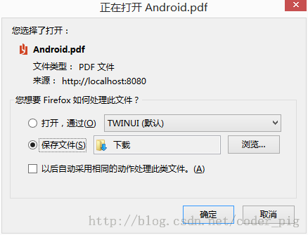 这个很简单,我们只需把③中设置Content-type的一行去掉,然后加上: resp.setHeader("content-disposition", "attachment;filename=Android.pdf");