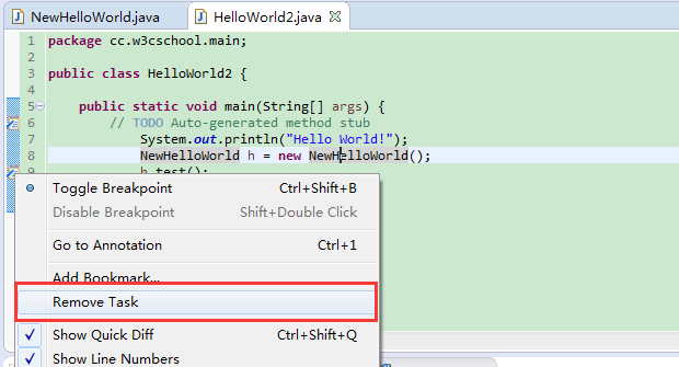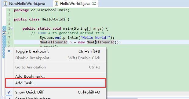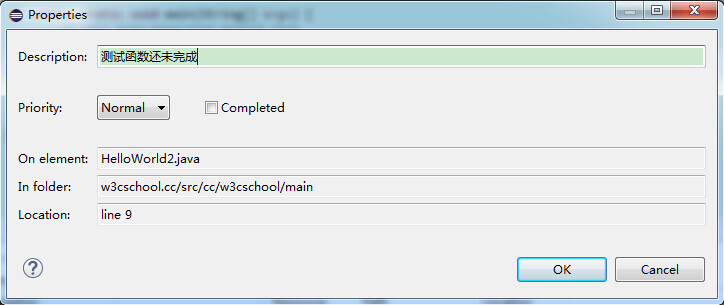 在Eclipse中我们可以通过鼠标右击垂直标尺并选择 Add Task 菜单来添加任务,在弹出的对话框中输入任务描述信息: