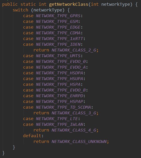 对了可能你想获取网络制式,而非普通的2G,3G,4G这样,其实我们可以到TelephonyManager类的源码里: