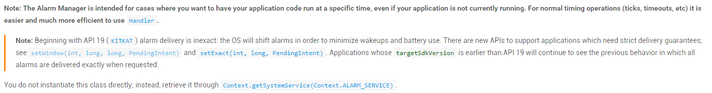 另外要注意一点的是,AlarmManager主要是用来在某个时刻运行你的代码的,即时你的APP在那个特定 时间并没有运行!还有,从API 19开始,Alarm的机制都是非准确传递的,操作系统将会转换闹钟 ,来最小化唤醒和电池的使用!某些新的API会支持严格准确的传递,见 setWindow(int, long, long, PendingIntent)和setExact(int, long, PendingIntent)。 targetSdkVersion在API 19之前应用仍将继续使用以前的行为,所有的闹钟在要求准确传递的情况 下都会准确传递。更多详情可见官方API文档:AlarmManager