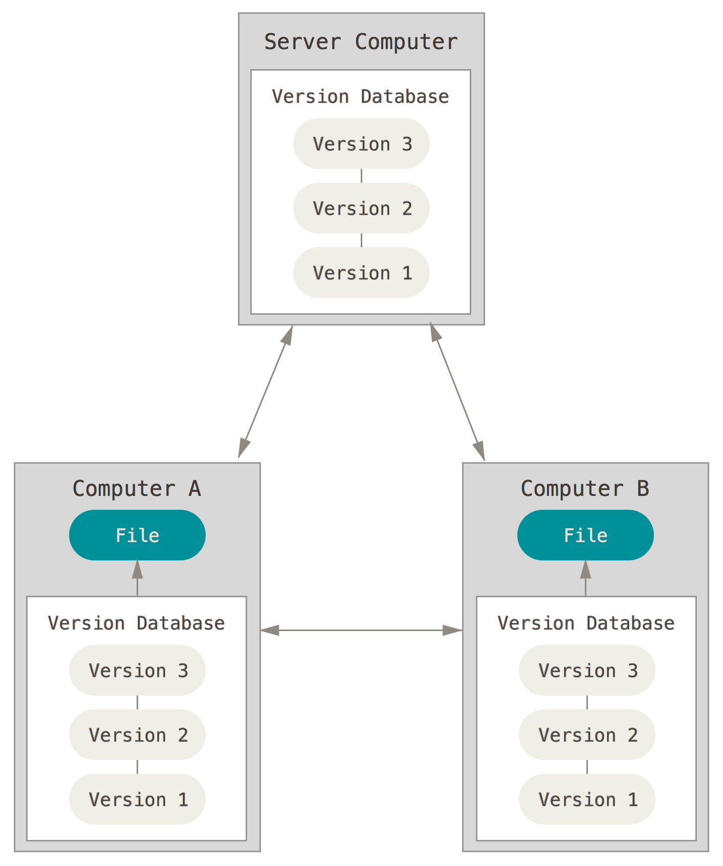 于是分布式版本控制系统(Distributed Version Control System,简称 DVCS)面世了。 在这类系统中,像 Git、Mercurial、Bazaar 以及 Darcs 等,客户端并不只提取最新版本的文件快照,而是把代码仓库完整地镜像下来。 这么一来,任何一处协同工作用的服务器发生故障,事后都可以用任何一个镜像出来的本地仓库恢复。 因为每一次的克隆操作,实际上都是一次对代码仓库的完整备份。