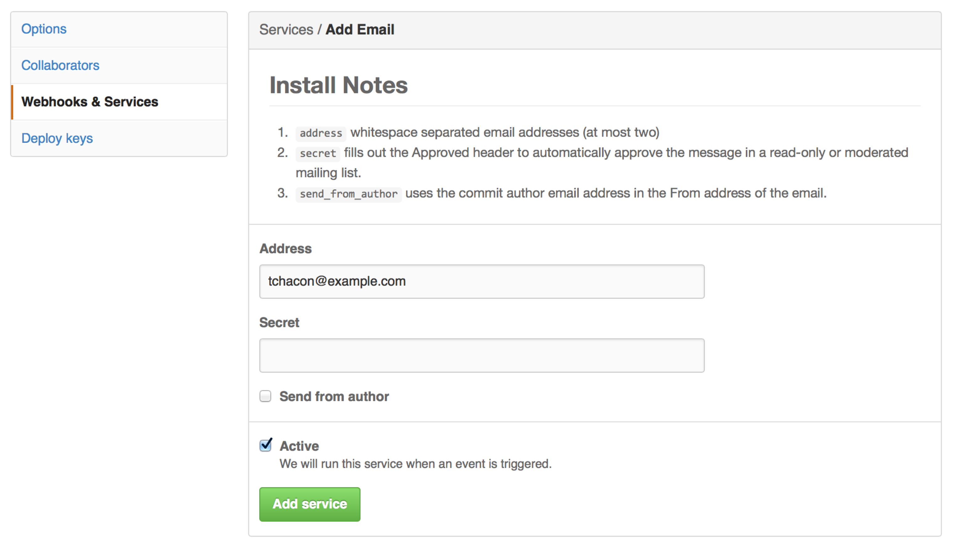 在本例中,如果我们点击 “Add service” 按钮,每次有人推送内容到仓库时,指定的电子邮件地址都会收到一封邮件。 服务可以监听许多不同类型的事件,但是大多数只监听推送事件然后使用那些数据做一些事情。