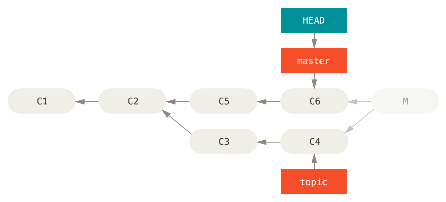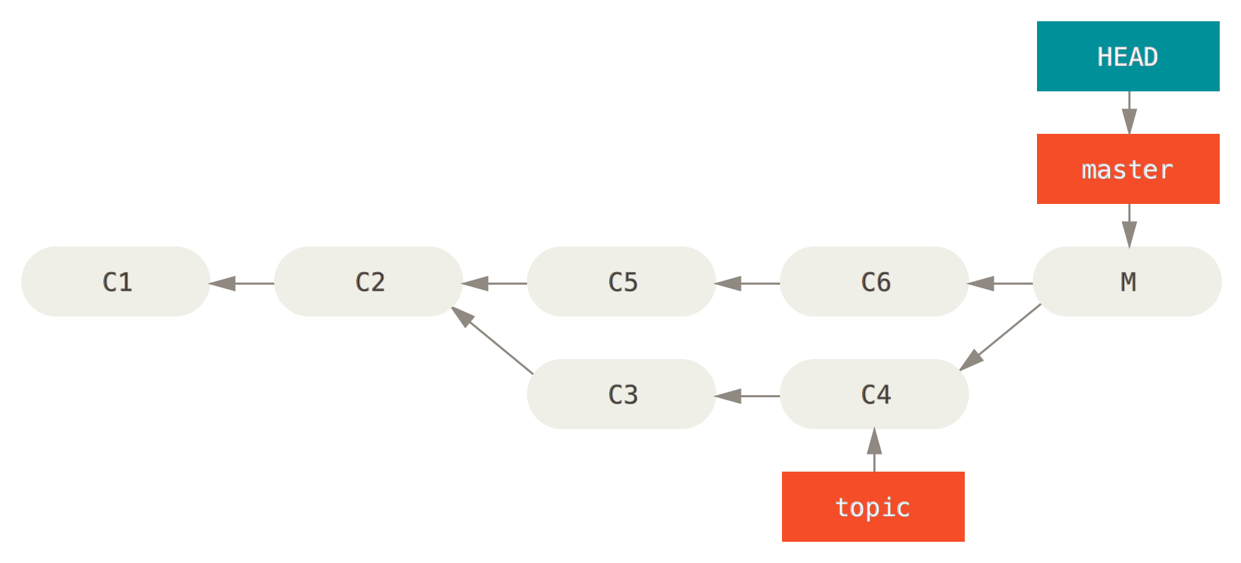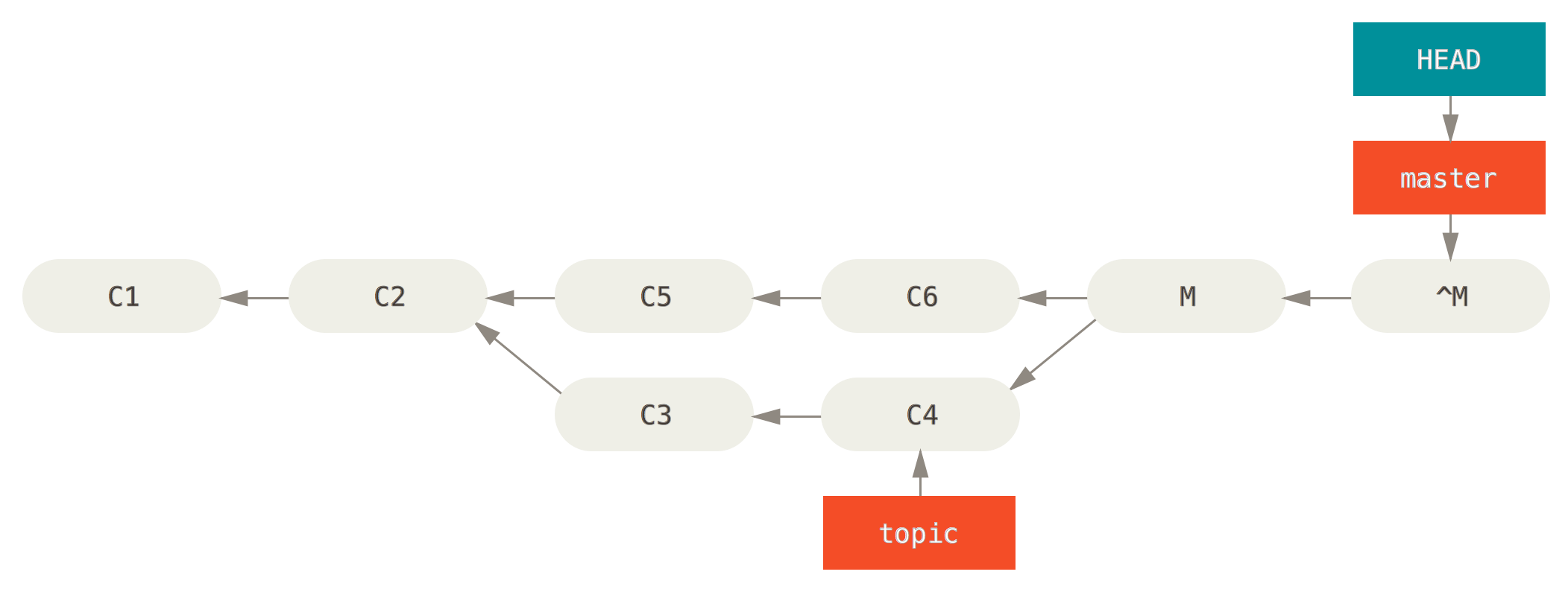 新的提交 ^M 与 C6 有完全一样的内容,所以从这儿开始就像合并从未发生过,除了“现在还没合并”的提交依然在 HEAD 的历史中。 如果你尝试再次合并 topic 到 master Git 会感到困惑: