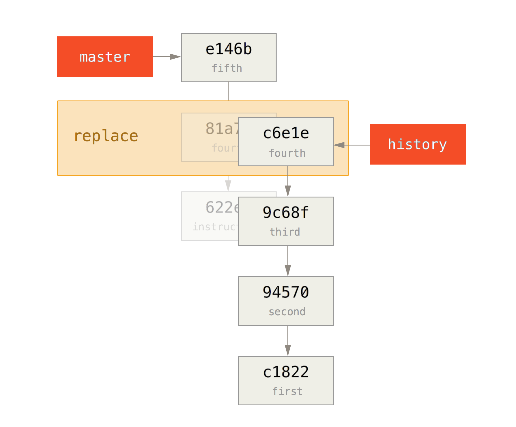 replace 命令可以让你在 Git 中指定一个对象并可以声称“每次你遇到这个 Git 对象时,假装它是其他的东西”。 在你用一个不同的提交替换历史中的一个提交时,这会非常有用。
