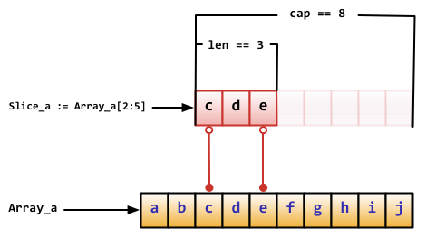 bSlice = aSlice[0:5] // 对slice的slice可以在cap范围内扩展,此时bSlice包含:d,e,f,g,h