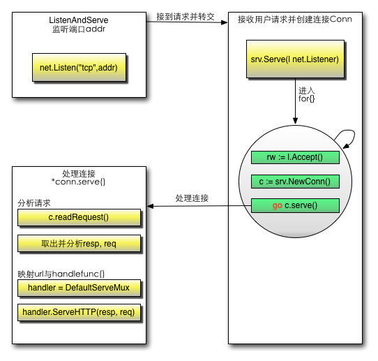 监控之后如何接收客户端的请求呢?上面代码执行监控端口之后,调用了srv.Serve(net.Listener)函数,这个函数就是处理接收客户端的请求信息。这个函数里面起了一个for{},首先通过Listener接收请求,其次创建一个Conn,最后单独开了一个goroutine,把这个请求的数据当做参数扔给这个conn去服务:go c.serve()。这个就是高并发体现了,用户的每一次请求都是在一个新的goroutine去服务,相互不影响。