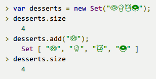 这个例子里元素都是字符串,不过Set是可以包含JS中任何类型的值的。同样,重复加入已有元素不会产生效果。