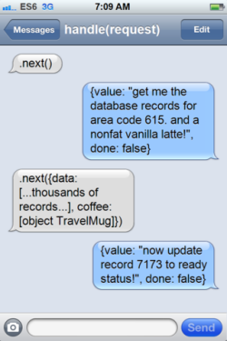 为了开始找出答案,考虑一下如果.next()的调用者只有一种方法可以传值返回给生成器会发生什么?仅仅是这一点改变,我们就可能创造一种全新的会话形式: