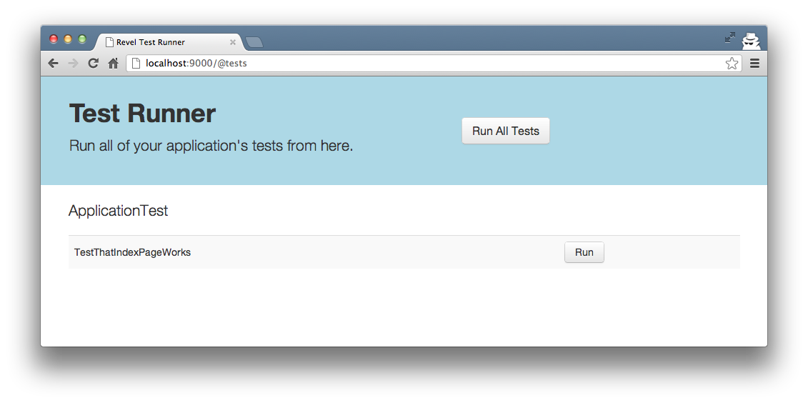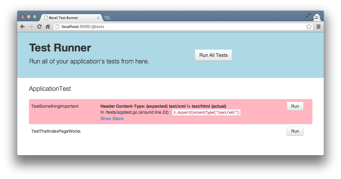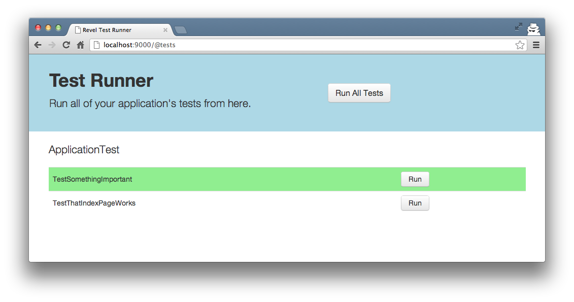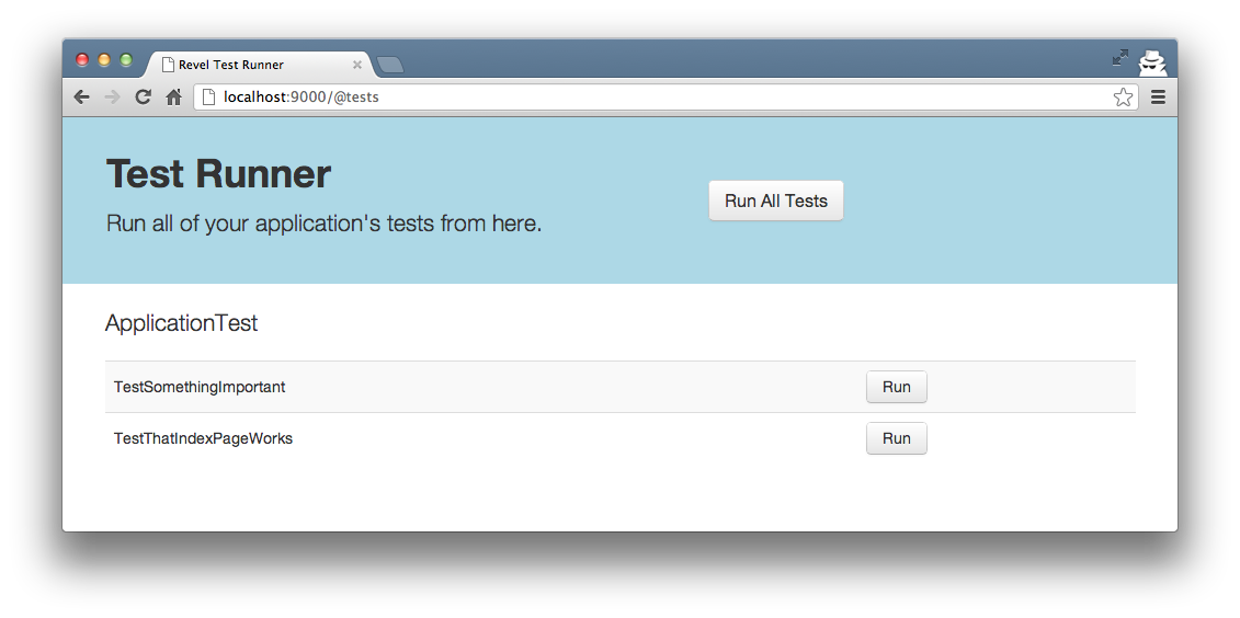 revel.TestSuite的一个structBefore() 、 After() 在每个测试方法之前和之后被调用,如果有的话。revel.TestSuite 帮助发出请求到你的应用程序,和对响应的断言。你可以用两种方式运行这个测试: