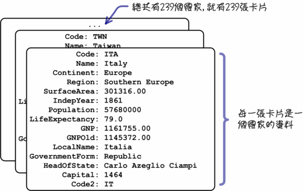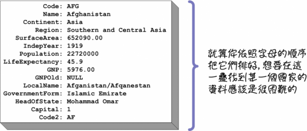 储存与管理资料一直是资讯应用上最基本、也是最常见的技术。在还没有使用电脑来管理你的资料时,你可能会使用这样的方式来保存世界上所有的国家资料: