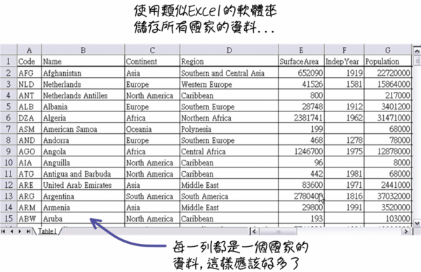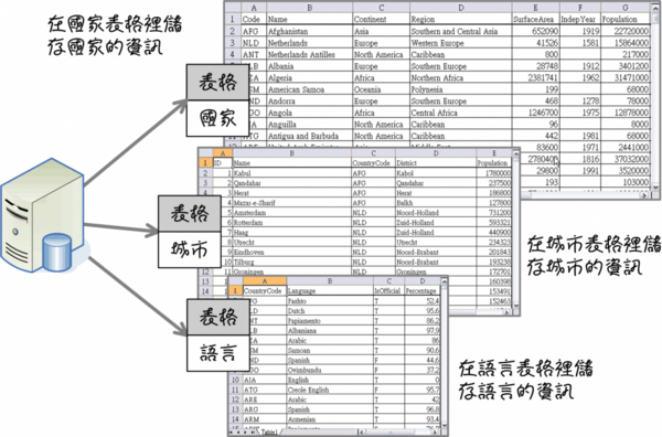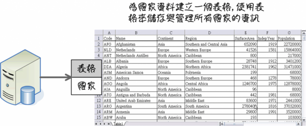 以储存世界资料的资料库来说,你想要把世界上所有的国家、城市和语言资料,在这个资料库中储存与管理。所以你会针对国家资料的部份,在世界资料库中建立一个储存国家资料的「表格、table」: