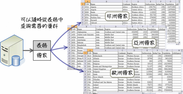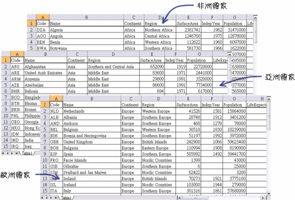 你不太可能把一个洲的国家资料,储存为一个工作表档案;就算你这么作了,如果你想要查询人口数小于十万的国家时,你会发现这会是一件很困难的工作。