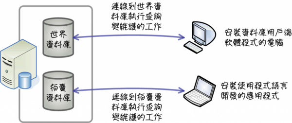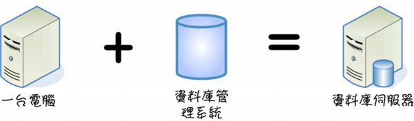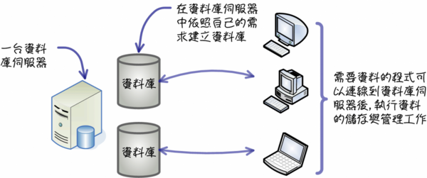 资料库管理系统是一种软体程式,它主要的工作就是储存与管理资料,如果你把这个软体程式安装在一台电脑中,这台电脑就会称为「资料库伺服器」: