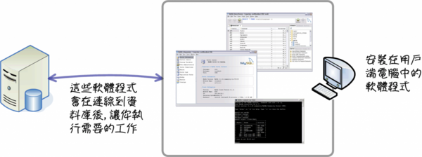 与资料库伺服器相对的是「用户端、client」,跟资料库伺服器比起来,用户端就会比较复杂一些:
