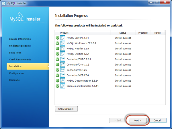 后面的步骤依照画面的指示,选择Execute或Next,就会进入开始安装的步骤。安装完成后,就可以准备进入设定MySQL资料库的步骤: