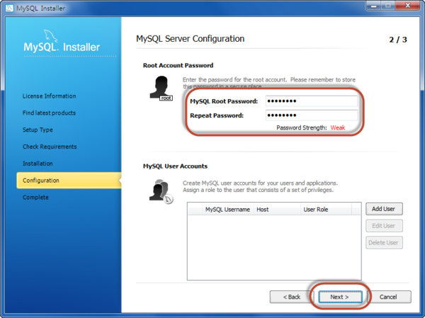 依照画面的指示,选择Next进入设定资料库管理员(root)密码的步骤,输入一个你自己决定的密码: