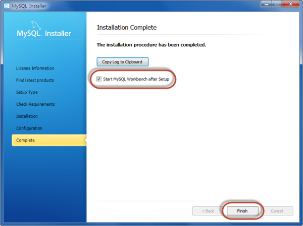 依照画面的指示,选择Next完成设定资料库的工作。在最后完成安装与设定的步骤,勾选Start MySQL Workbench after Setup选项后,选择Finish结束安装与设定MySQL资料库的工作。