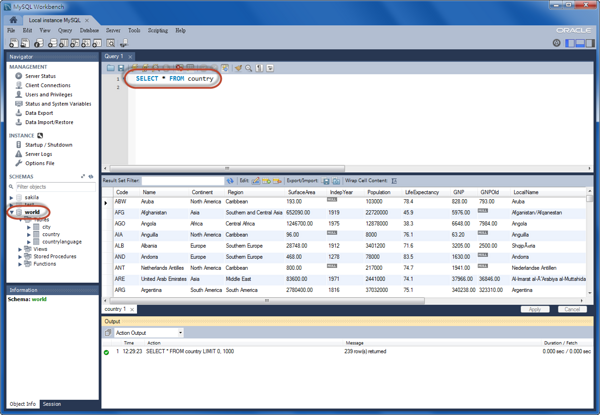 连线到资料库后,在左侧的World资料库名称上点两下(Double click),会发现World会变成粗体字,表示目前开启(作用中)的资料库。在画面中输入一个测试的SQL叙述,SELECT * FROM country。输入完后,按下执行叙述的快速键Ctrl + Enter,就可以看到所有的国家资料:
