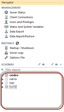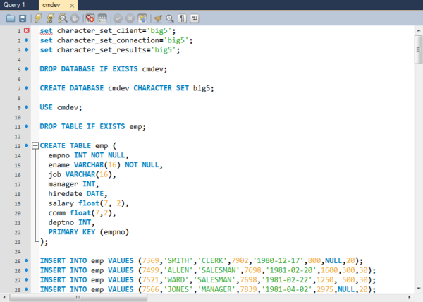 在MySQL Workbench中选择Query->Execute(All or Selection),Workbench会花一点时间执行所有的叙述。执行完成后,在资料库列表区块的任何空白位置,按滑鼠右键后选择Refresh All,就可以看到安装好的新资料库cmdev: