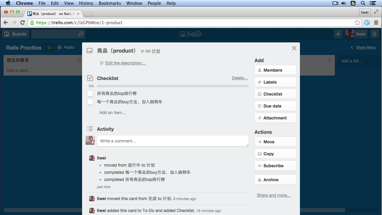 我在“计划”里增加了一个 card,在 checklist 中记录了这两个需求。当我们开始功能开发的时候,可以将 card 拖动到“进行中”,当我们完成一个功能的时候,可以在 checklist 的项目前打一个√,当我们完成一个 card 的任务后,可以讲 card 拖动到“完成”中。