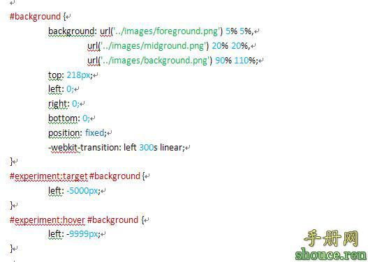 将CSS背景容器设置在一个固定的位置,并通过top、left、bottom和righ属性让它占据页面的底部。背景图片通过 background属性来指定,最先指定的就是最顶层的背景。每一幅图片都按照百分比进行定位,而且它们的位置各不相同,这样当容器的尺寸改变的时候, 各个图像就会发生移动,从而产生视差效果
