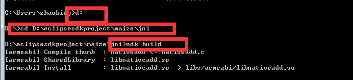 5.命令行中进入jni文件目录,使用ndk-build命令生成.so文件: