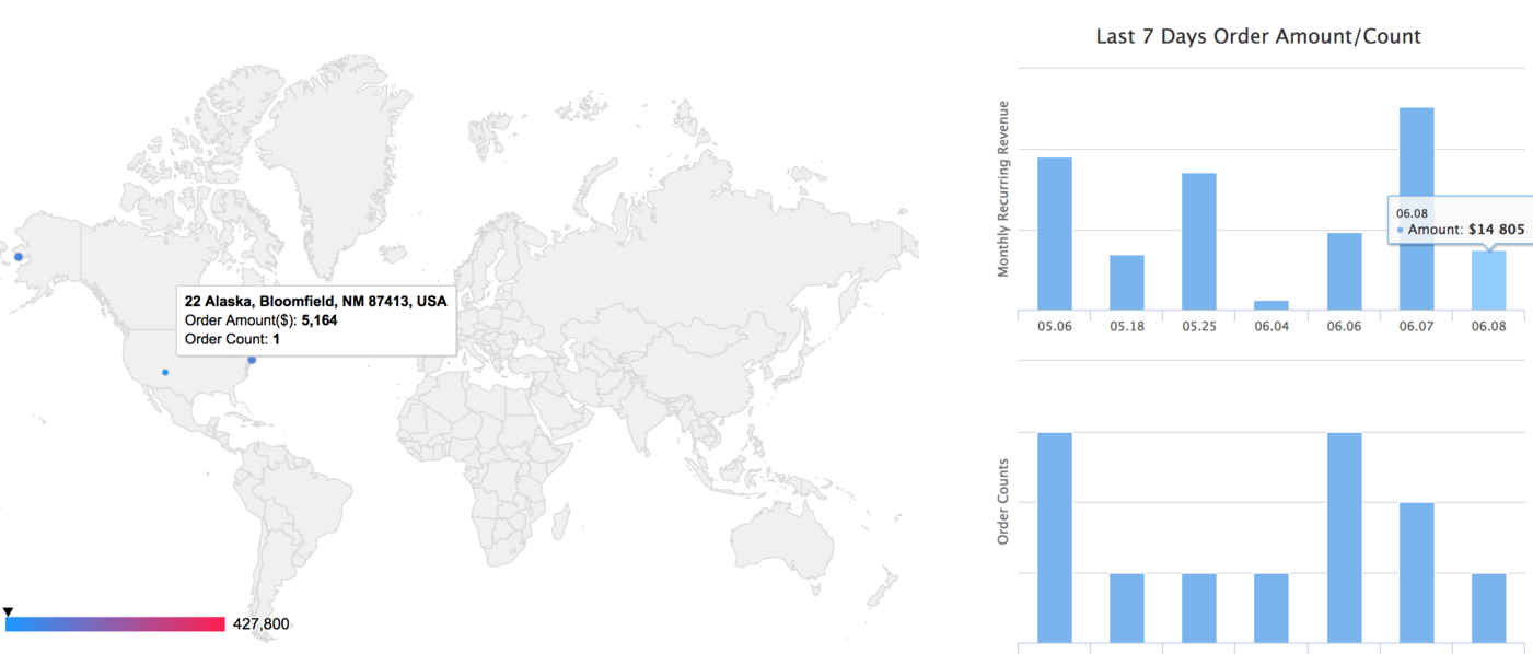 将所有的订单数据做一个图表展示,左边的地图展示每个city的成单情况,右边的图形,展示最近7天的成单情况。由于后端的数据需要前端做一些解析,如向谷歌请求每个city的经纬度,所以后端给前端原始的订单数据,前端进行格式化和归类展示。另外把原始数据直接放前端,前端处理起来可以比较灵活,想怎么展示就怎么展示,不用每次展示方式变的时候都需要找后端新加接口。