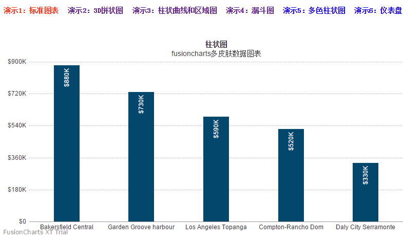 fusioncharts是一个简单好看的柱状统计图,本文中的统计图是由PHP动态生成,要是你想用js生成该柱状图,右击鼠标查看网页源代码。