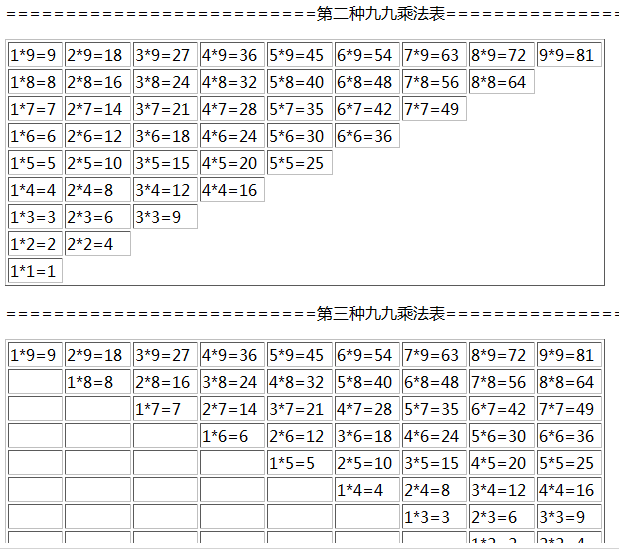 echo "<p>==========================第三种九九乘法表=====================================</p>";