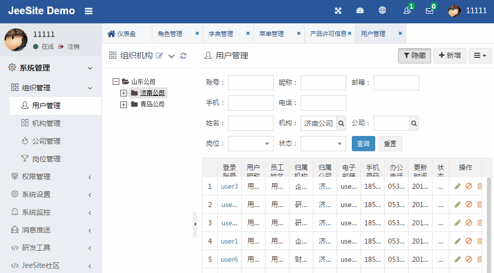 * 管理员账号system与admin的区别:system为开发者使用的最高级别管理员,主要用于开发和调试,有些修改会直接影响系统的正常运行;admin为客户方使用的系统管理员,用于一些基础数据配置,如机构、用户、权限、用户字典等。