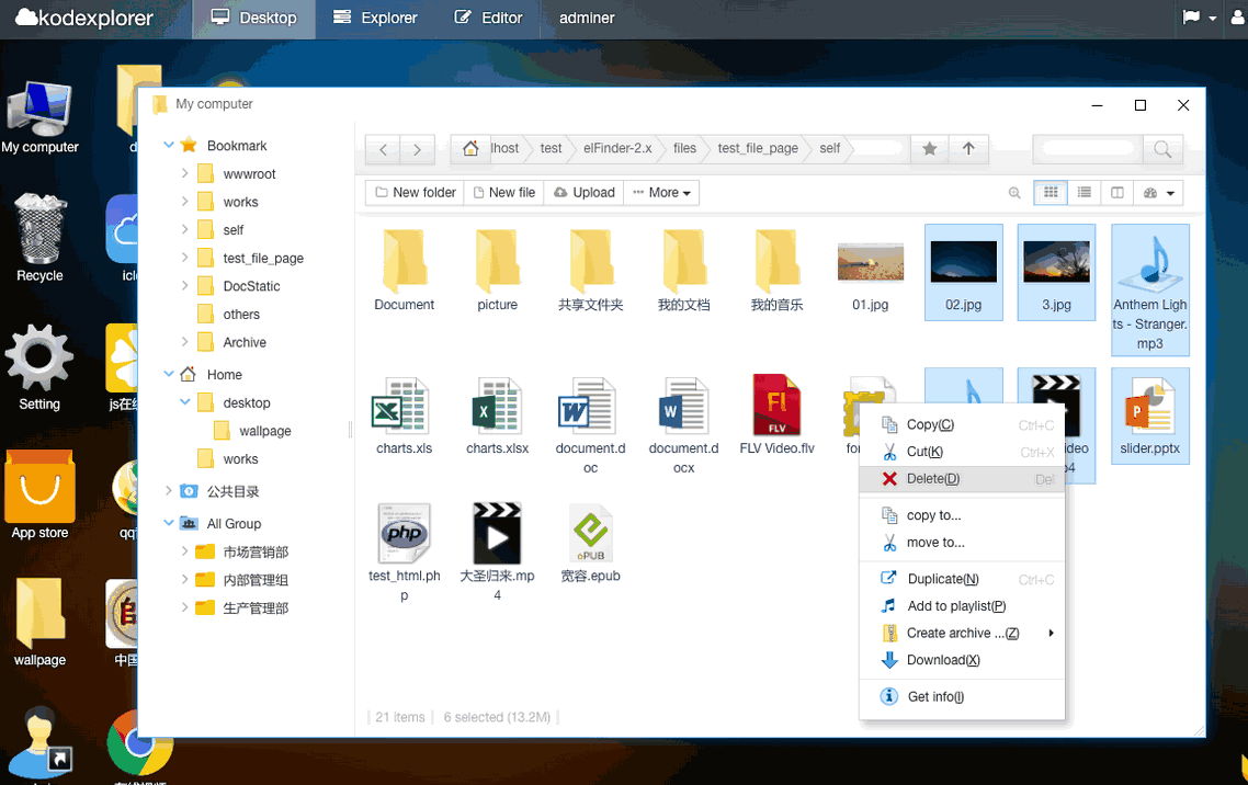 框中选择,拖拽移动,拖拽上传,在线编辑器,影音播放器,解压缩。全面ajax保证性能和体验!
