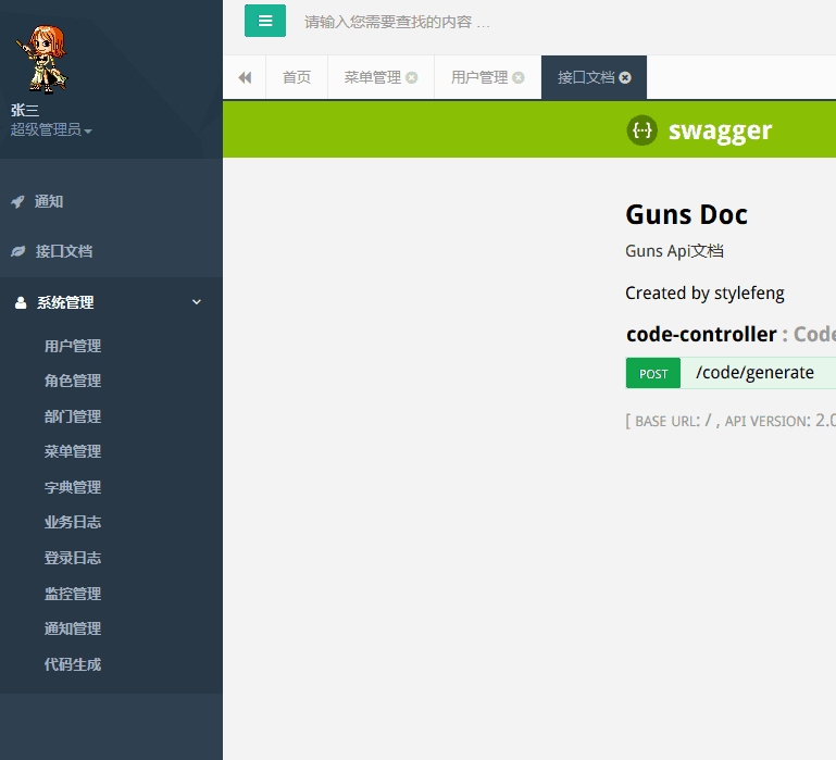 Guns基于Spring Boot,致力于做更简洁的后台管理系统,完美整合springmvc + shiro + mybatis-plus + beetl!Guns项目代码简洁,注释丰富,上手容易,同时Guns包含许多基础模块(用户管理,角色管理,部门管理,字典管理等10个模块),可以直接作为一个后台管理系统的脚手架!