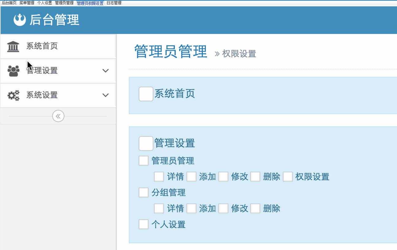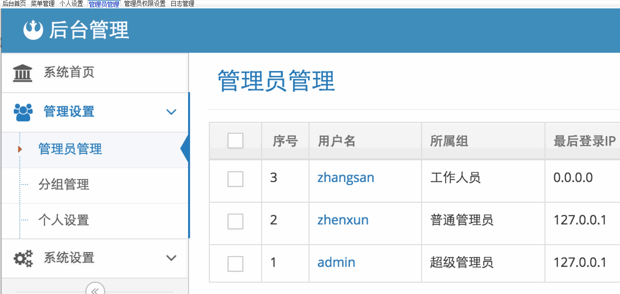 TP5Admin使用thinkphp5框架+Bootstrap开发,后台已做好菜单与权限管理,支持一个管理员多个组。其主要目的是为了提高开发效率,需要开发什么功能,后台直接添加菜单,程序里直接写控制器!
