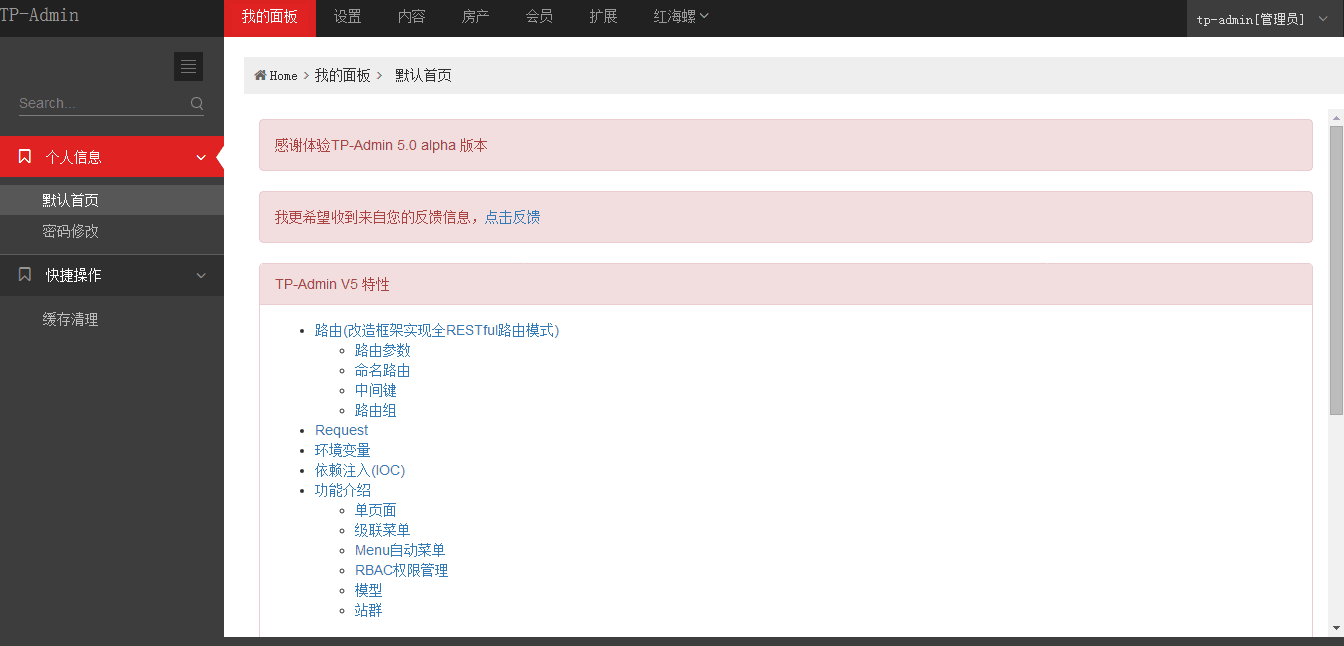 红海螺CMS(TP-Admin V5)是一个拥有站群功能的多功能CMS基础系统,底层融合了Slim 2.6和ThinkPHP 3.2两个框架,在此基础上改造了MVC结构、泛域名匹配机制、在MVC的基础上新增Logic层、重构路由机制实现与当下主流的开源框架(如:laravel,YII等)路由机制相类似的RESTful。能帮助你快速构建大型门户站点,以及快速的开发一个简单但是强大的WEB应用以及API接口。