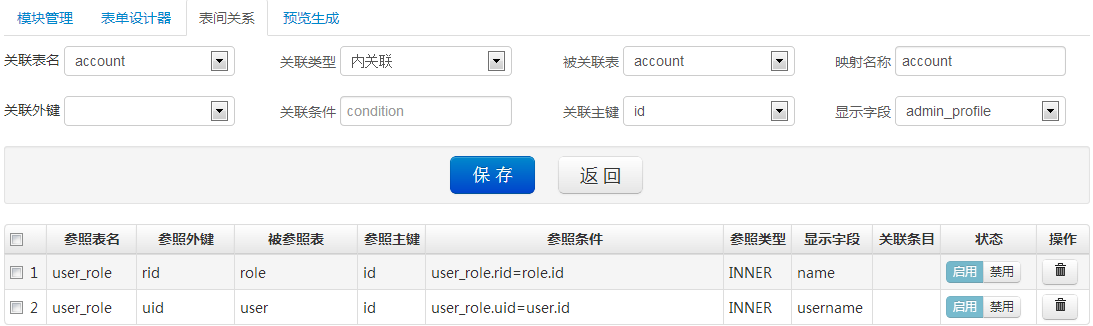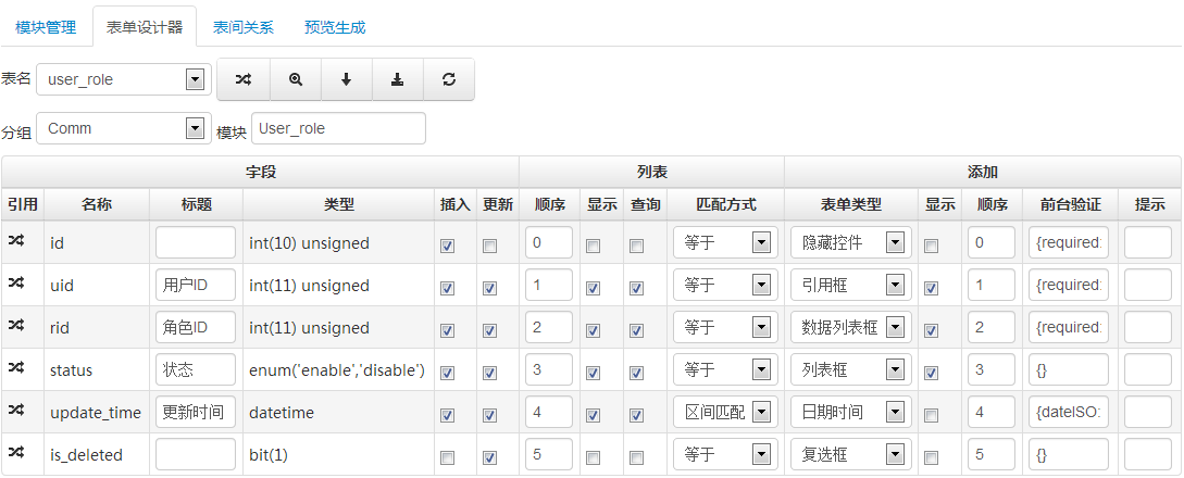 2、设置外键字段在列表中的显示字段。前台列表界面显示时,如果这个外键是要显示的字段,不能直接显示,否则显示的就是用户ID或者角色ID,应该显示的字段是用户名和角色名称,这个叫显示字段。我做的生成器是这个字段可以在表间关系界面中设置,默认显示第二个字段(一般第一个字段是主键)。然后在列表中显示时显示用户名。