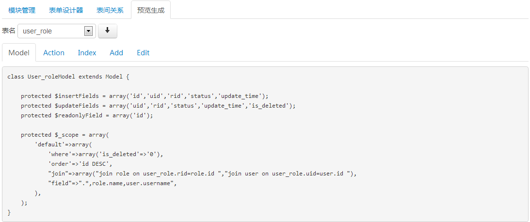 3、在Model中,写入用户表和角色表的关联和显示字段。将以上两条所提到的信息保存下来,用于编辑和列表界面的数据显示。